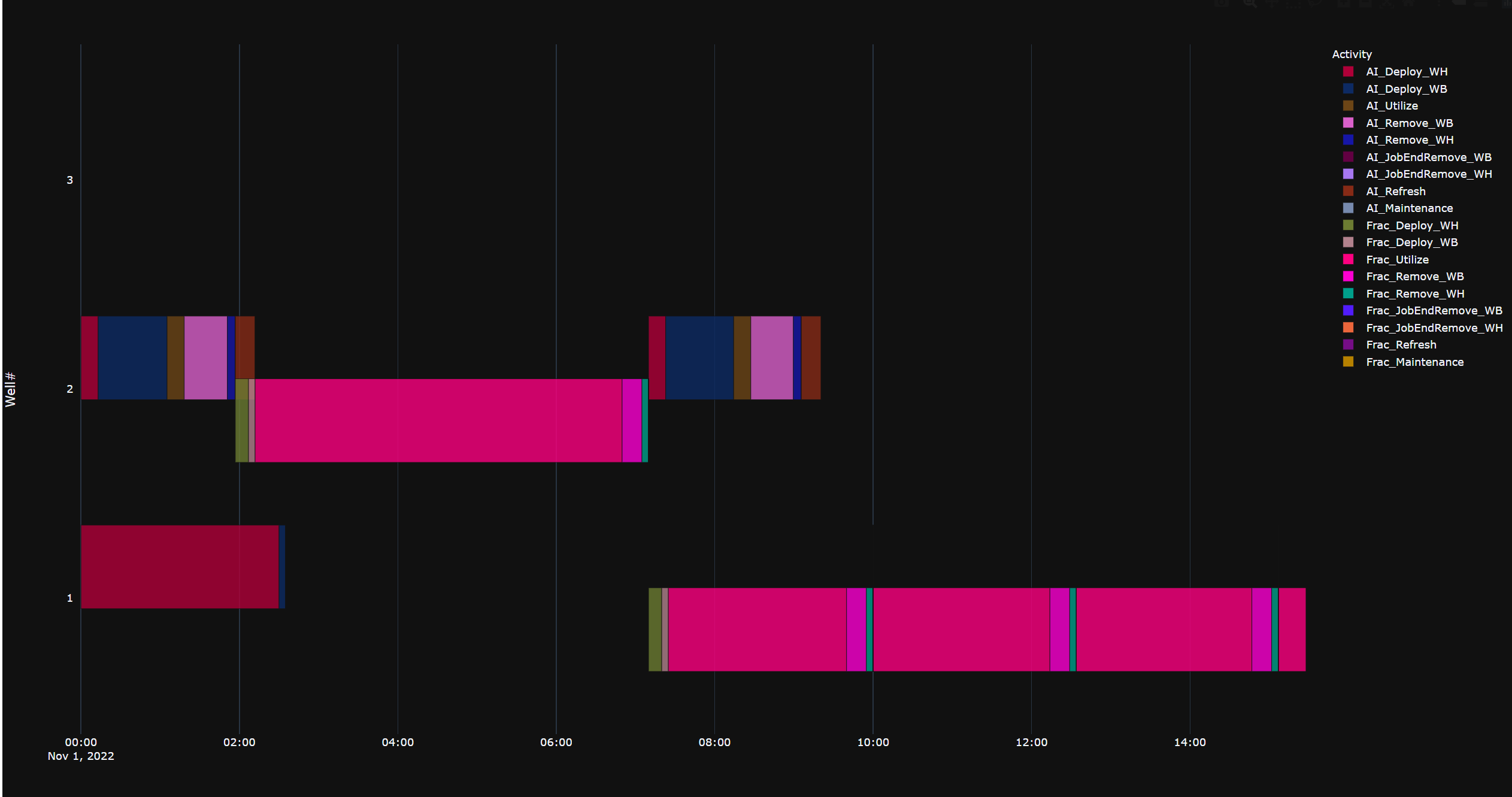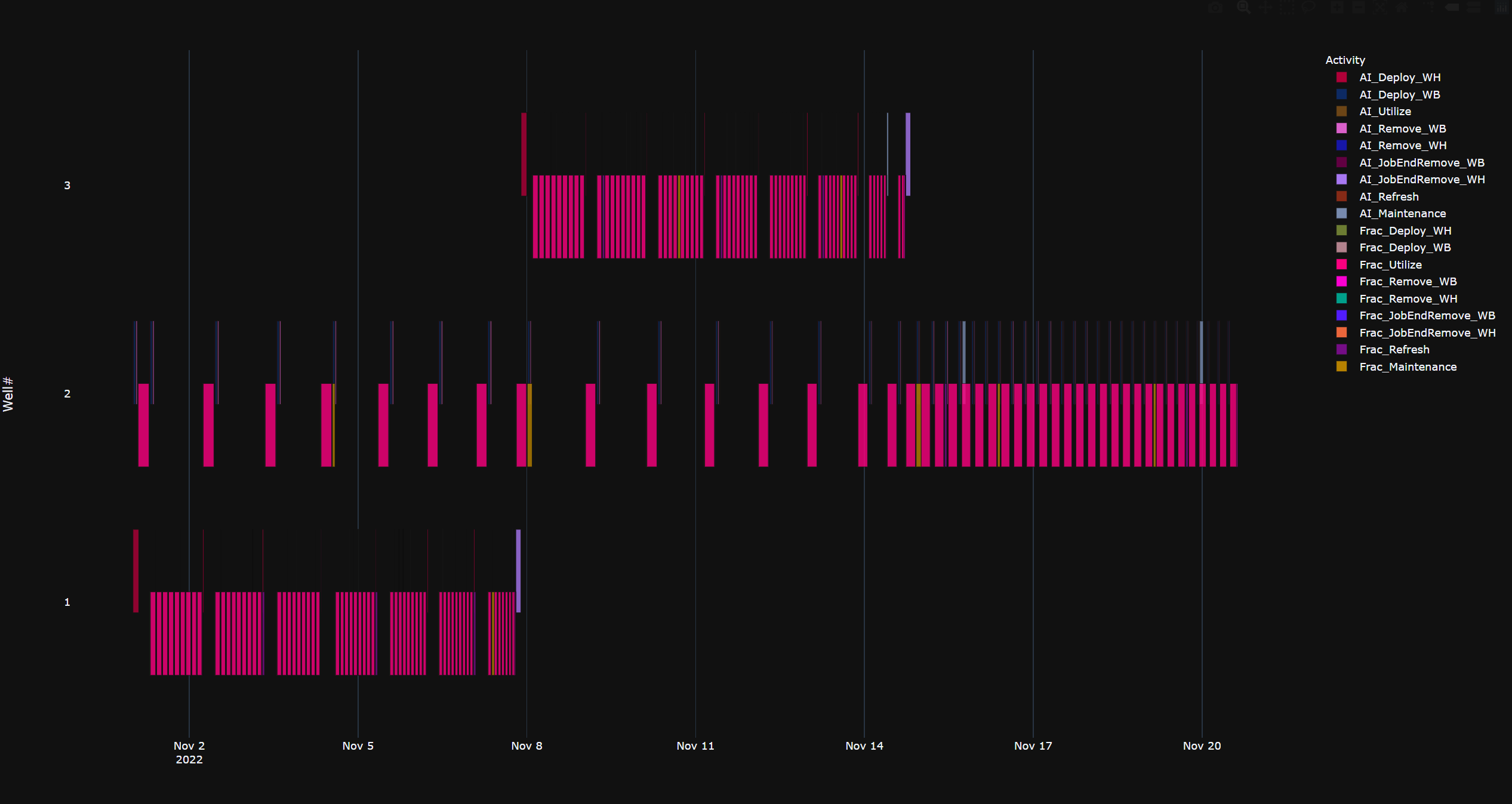 I have create a gannt chart a few different ways: thick lines, filled areas, and, what seems to work best, is a timeline plot. It seems this number of traces is considered a large amount by plotly (zooming, etc is not smooth).