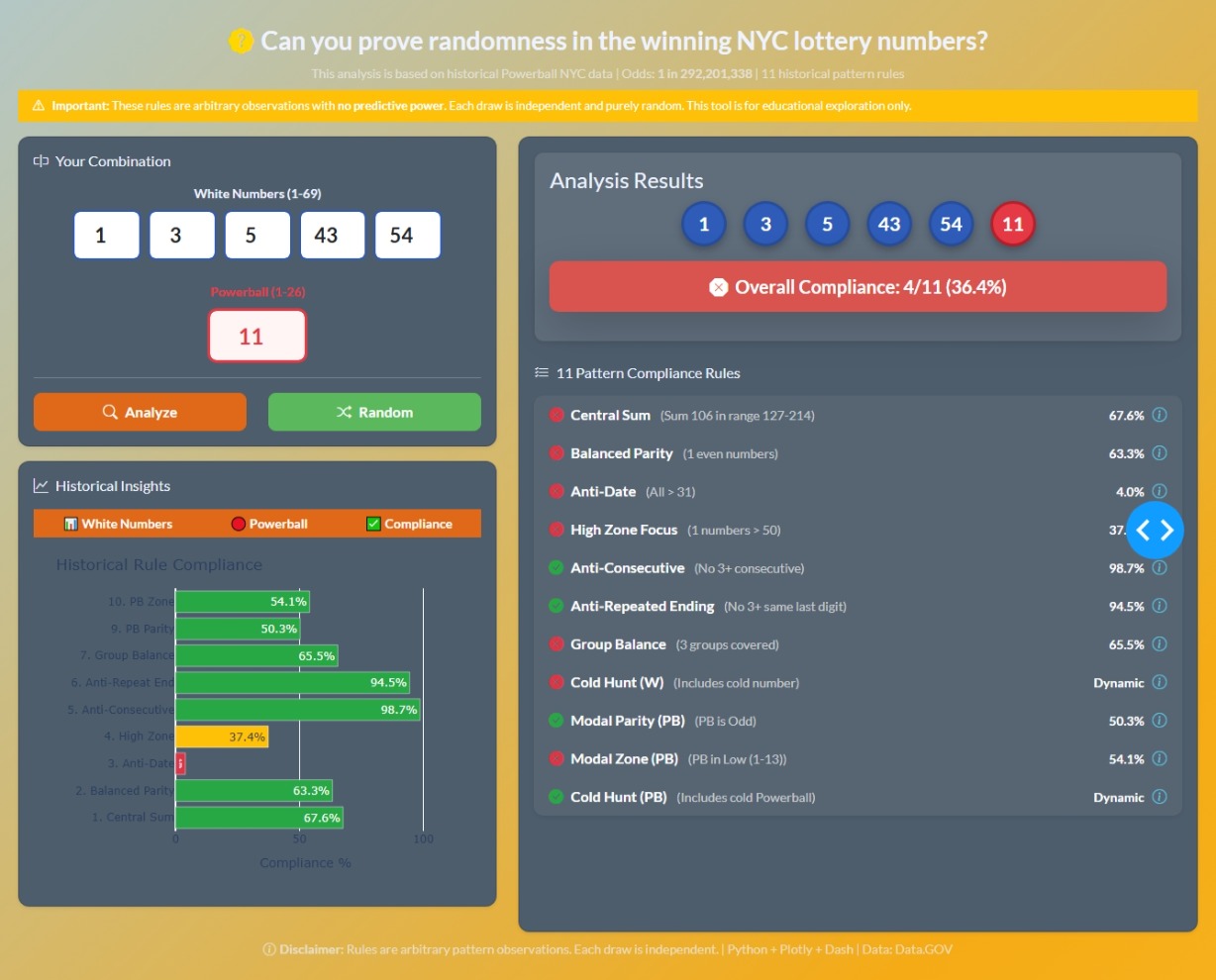 This histogram on the left shows the distribution of winning number positions. The timeline plots on the right shows the winning number positions from 2010 to 20215.