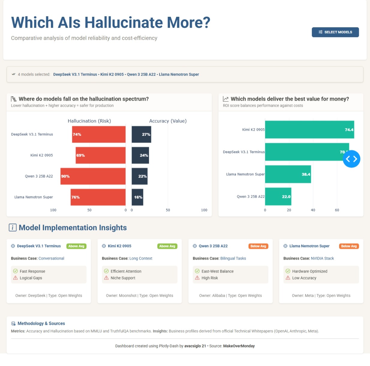 My first idea was to use a scatter plot, Hallucination Index vs Accuracy Index (inverted scale) and create high-risk and low-risk zones. Then I read the article shared along with the dataset (Voronoi article, a really cool scatter plot by VizMaya with exactly the same approach). So, I decided to pivot and was between a dumbbell chart or a butterfly chart; in the end, the latter helped me more with the narrative I wanted to tell.