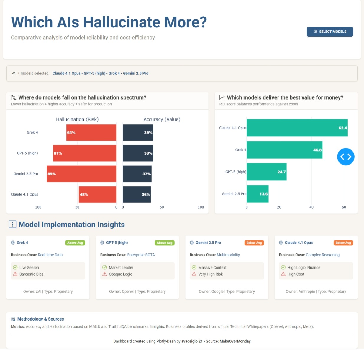 {"Model": "Claude 4.1 Opus", "Accuracy": 36, "Hallucination": 48, "Type": "Proprietary", "Owner": "Anthropic", "BestFor": "Complex Reasoning", "Pros": "High Logic, Nuance", "Cons": "High Cost"},