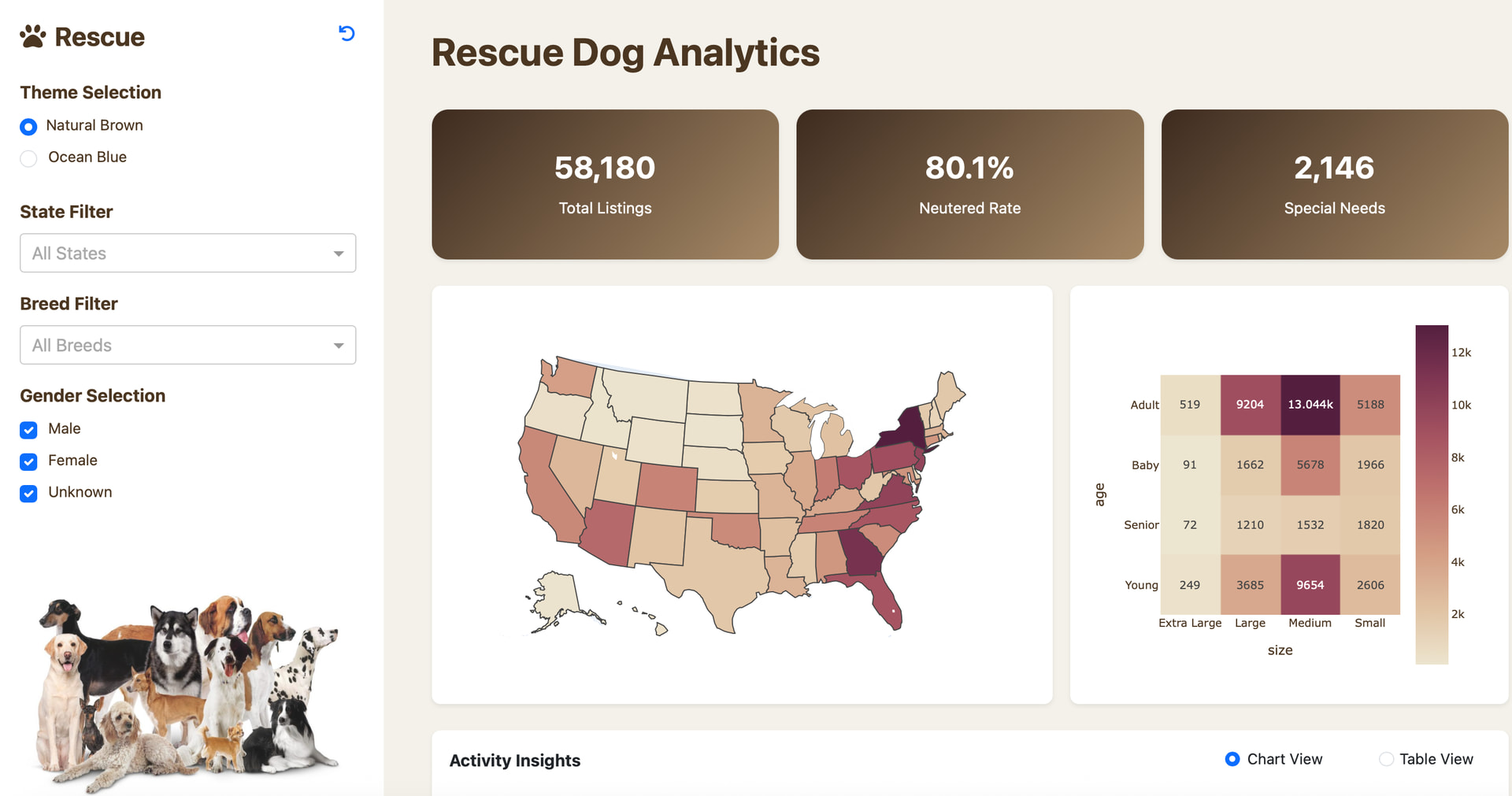 Filters along the top reduce the data reported in 5 Mantine cards and in the visualizations below them. The filters select one or more US states, age ranges, primary breed and dog names.