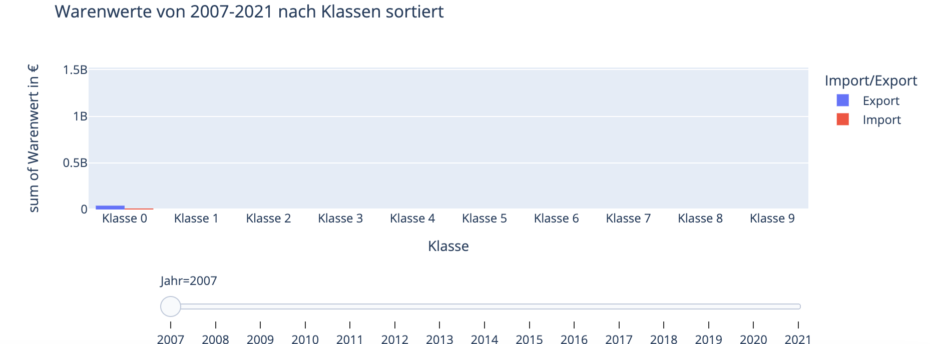 fig = px.histogram(df_for_slider1, x="Klasse", y="Betrag", color='Import/Export', barmode='group', height=400, animation_frame="Jahr", animation_group="Klasse", labels={'Betrag':'Warenwert in β¬'}, title='Warenwerte von 2007-2021 nach Klassen sortiert')