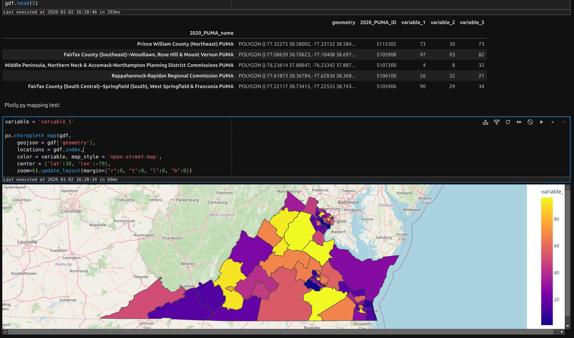 Another potential hurdle is that my GeoJSON file (which I created within GeoPandas) does not have any “id” field; however, I imagine that I can use the featureidkey parameter to inform Plotly which label (e.g. ‘2020_PUMA_name’) to use instead.