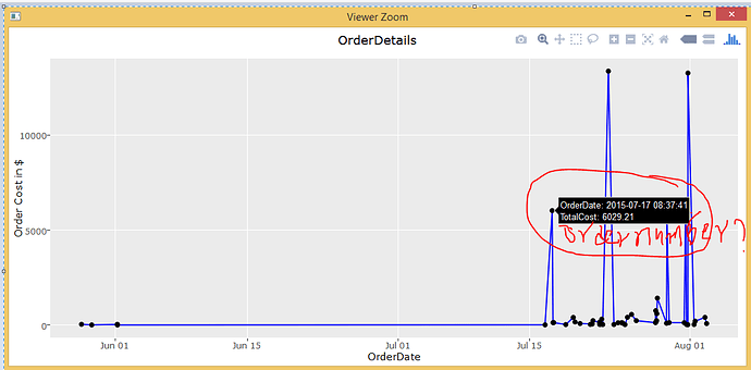 I have dataset (sample) something it’s looks like a below(or PFA) and here I have a requirement like this whenever user placed mouse on it, it needs display Ordernumber,OrderDate,Totalamount at this moment i’m getting only OrderDate and Totalamount as I have passed these 2 parameters to X and Y.Can anyone guide me how to do that .Here I’m attaching sample data as well R script that you can use it for to plot the graph .