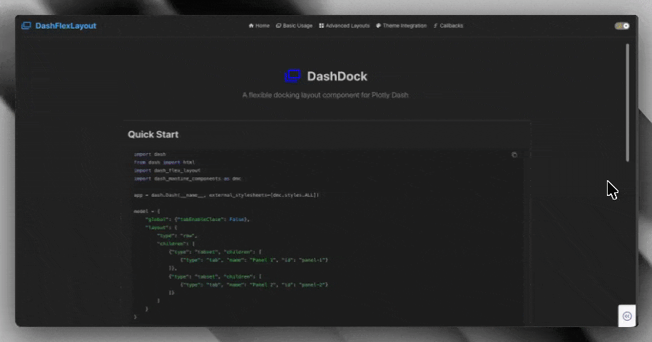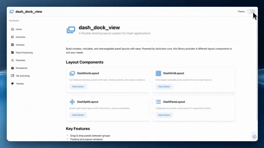 Dash Dock View brings the power of RC-Dock to Dash, offering a premium layout system with drag-and-drop panels, tabbed interfaces, and floating windows. Perfect for dashboards, data exploration tools, and complex applications.