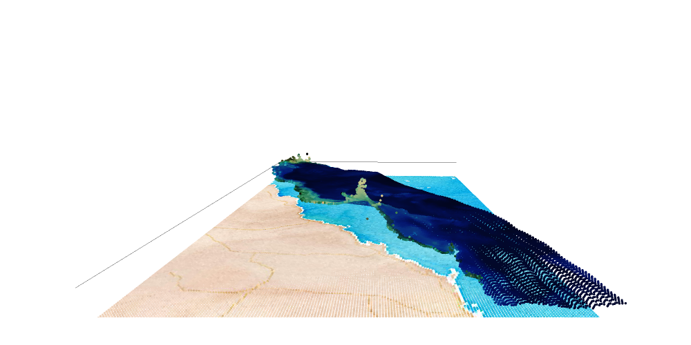eye <- list(x = 0.065, y =-1.625, z = 0.2925) scene = list(camera = list(up = list(x=0, y=0, z=1), center=list(x=0, y=0, z=0), eye = eye), xaxis = list(range = c(142.1688, 157), title="", showline=FALSE, showticklabels=FALSE, showline=FALSE, showgrid=FALSE), yaxis = list(range = c(-28.7, -7.01), title="", showline=FALSE, showticklabels=FALSE, showline=FALSE, showgrid=FALSE), zaxis = list(range = c(-2.4,8), title="", showline=FALSE, showticklabels=FALSE, showline=FALSE, showgrid=FALSE), showlegend = FALSE ) for (i in 1:dim(z)[3]) { p <- plot_ly(x=x, y=y, z=c(z[,,i]), type="scatter3d", mode="markers", marker=list(color=c(truecolor[,,i]), size=2, alpha=0.5), showlegend=FALSE) %>% layout(scene = scene) p <- add_trace(p, x=mapx, y=mapy, z= - 2.4, type="scatter3d", mode="markers", marker=list(color=mapcolor, size=2), showlegend=FALSE) fname <- paste0('elev_movie/A', 100000 + i, '.png', collapse='') plotly_IMAGE(p, format="png", out_file=fname) }