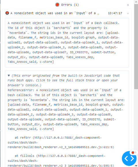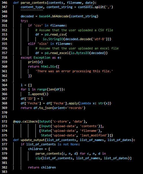 Hello everyone, i’ve been working in a dash app who receives an xlsx, csv or txt file with an especific format (template) from the user pc. I’m looking for a sort of advisory $$ or consultancy $$ per hour in order to solve the next troubles: I’ve already the app, is just needing an especific fixes (i guess they are mainly in the way how the csv or xlsx is processed, generating a df an then, converted to json to store it in a dcc store, wich is going to be called in around 10 callbacks in order to process the df and generate a graphs and tables wich are incluiding in the dash app layout.