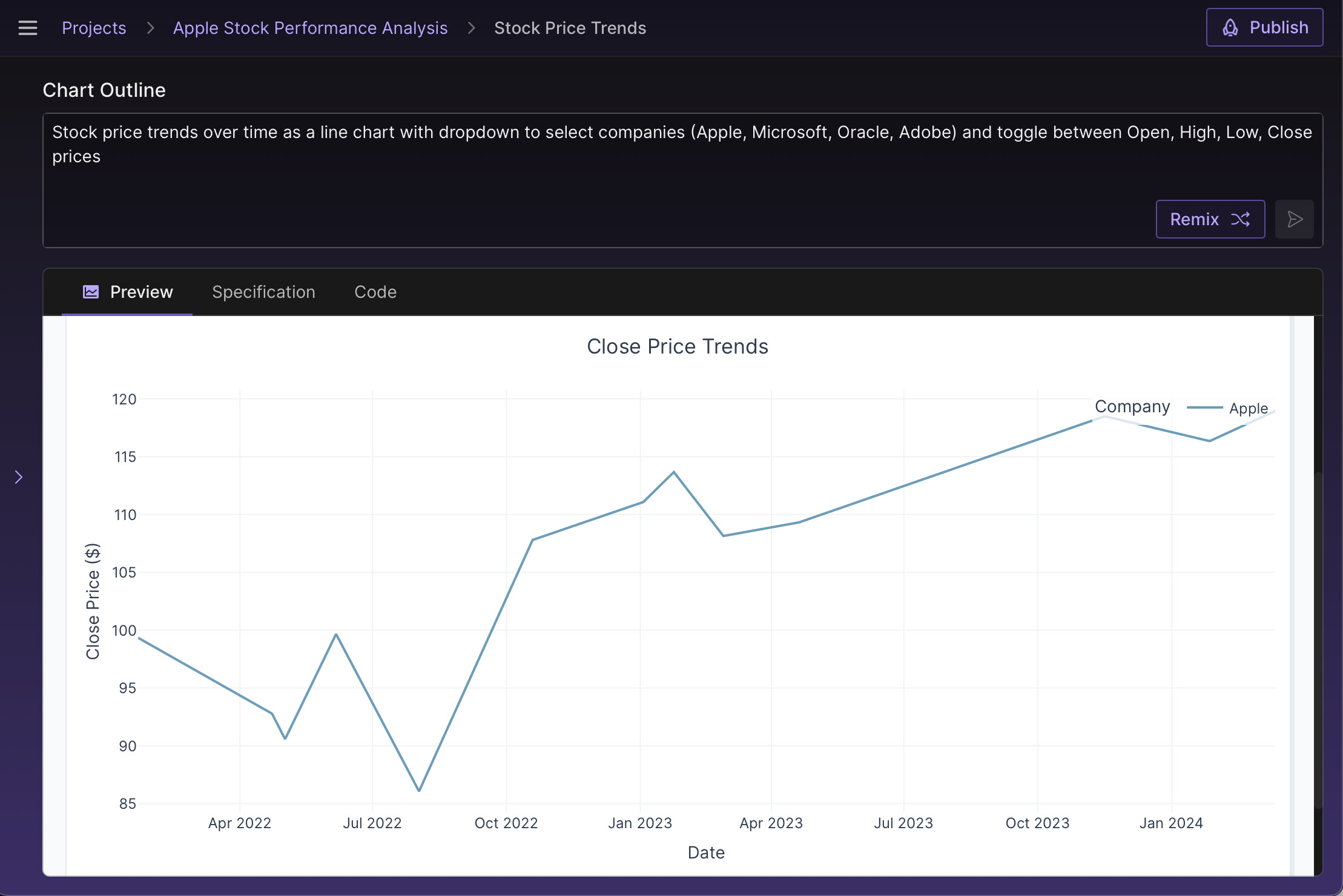 Now all you have to ask for vertical rules to be overlaid on this chart to signify important product releases. The LLM behind the scenes knows these dates and easily adds the marks and labels.