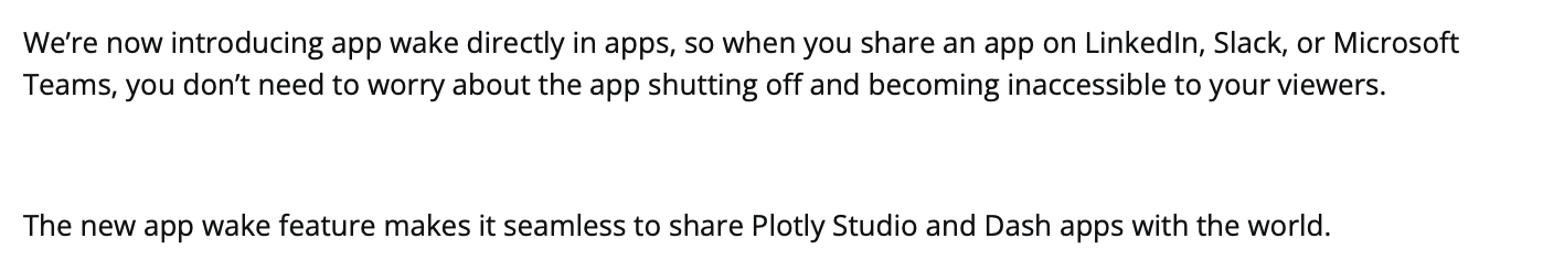 The new app wake feature makes it seamless to share Plotly Studio and Dash apps with the world.