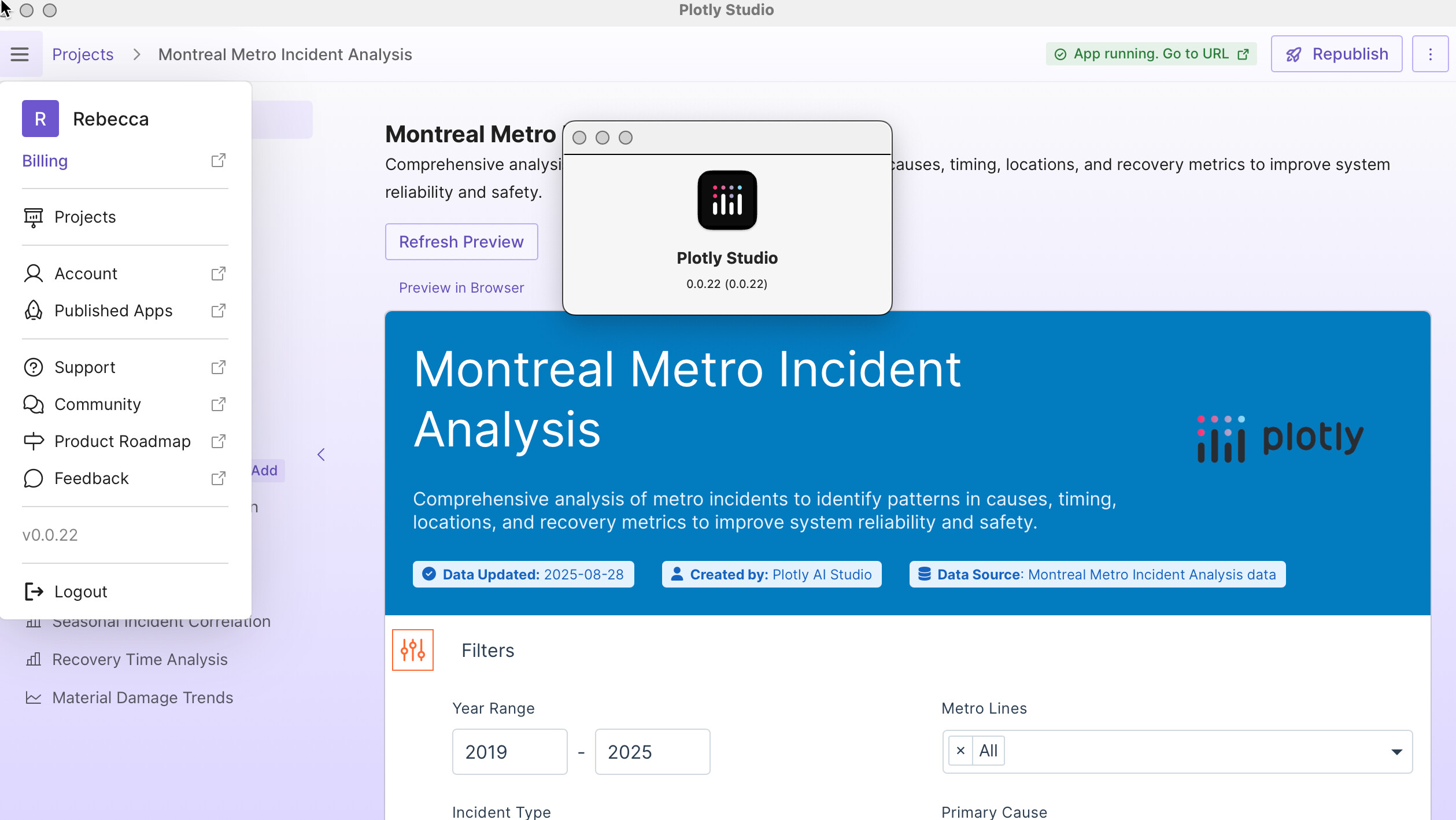 It would help if the logs showed the version of plotly studio that was used for publishing. The only place I could get that